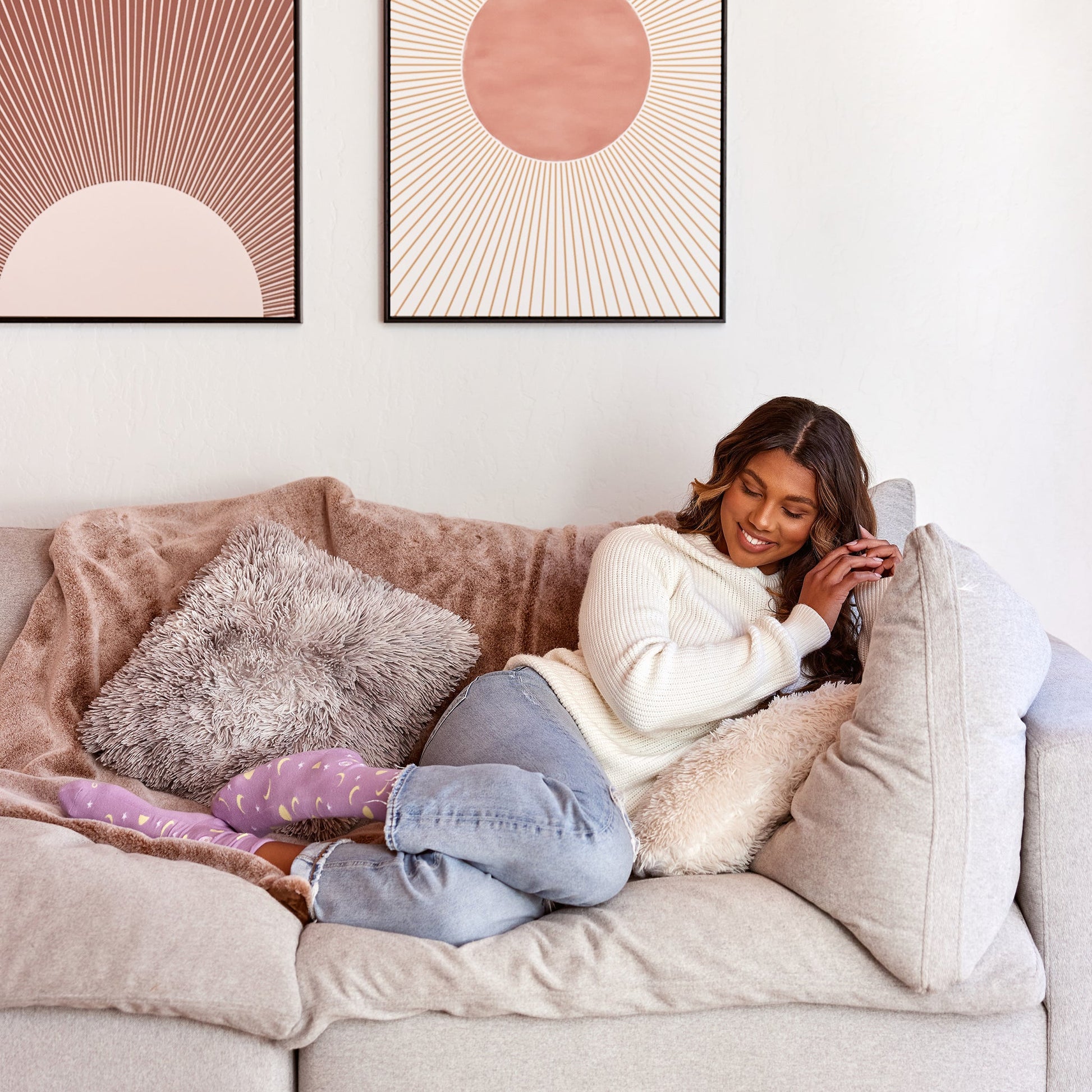 Just like the moon, we all go through phases. This calming, celestial pair with a sunshine embroidery is for anyone who loves to make moments for themselves to rest and recharge. Pairs perfectly with a warm cup of tea and a face mask, and serves as your reminder that you are loved and worthy through all the ups and downs.