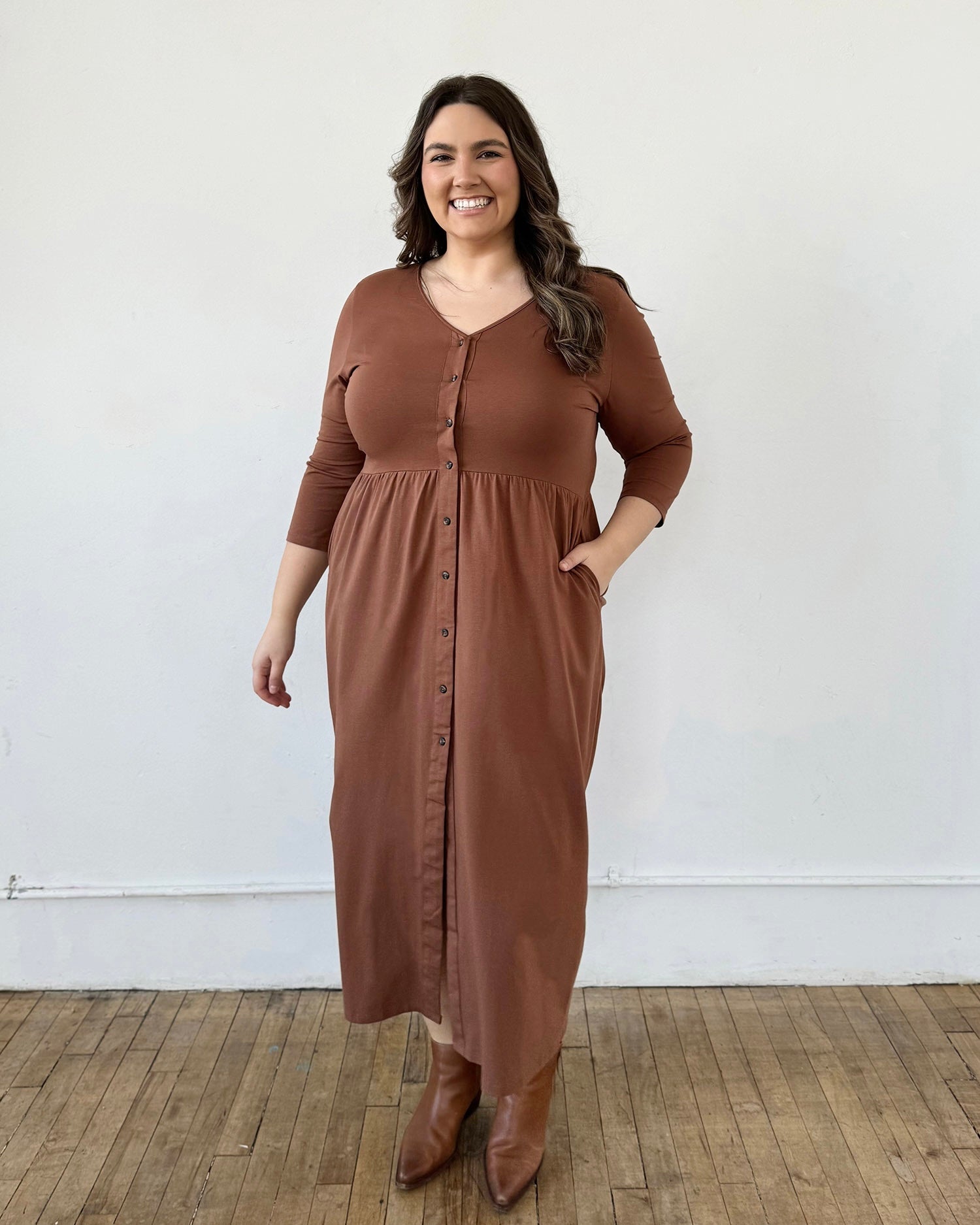 This effortless dress makes an elongating statement with the center button placket and slit. Hidden pockets are in the side seams, and the fitted 3/4 length sleeves can layer under cardigans. Nursing mamas will enjoy that the first few buttons are functional.
