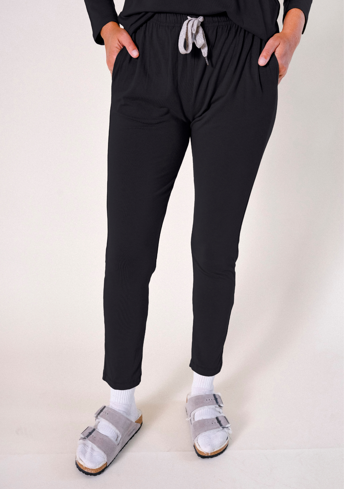 Our Toni Pajama Pant in classic Black gives you the comfort you crave for lounging, relaxing, or a good night’s sleep. Made from a lightweight blend of Rayon from Bamboo and Cotton Jersey. The fabric is buttery-soft, cool, and gentle on the skin. Details include side-slit pockets, cinched waist with drawstrings, and a tapered leg. Pairs nicely with our Toni Pajama Shirt in Black. Made in Los Angeles, California. FINAL SALE
