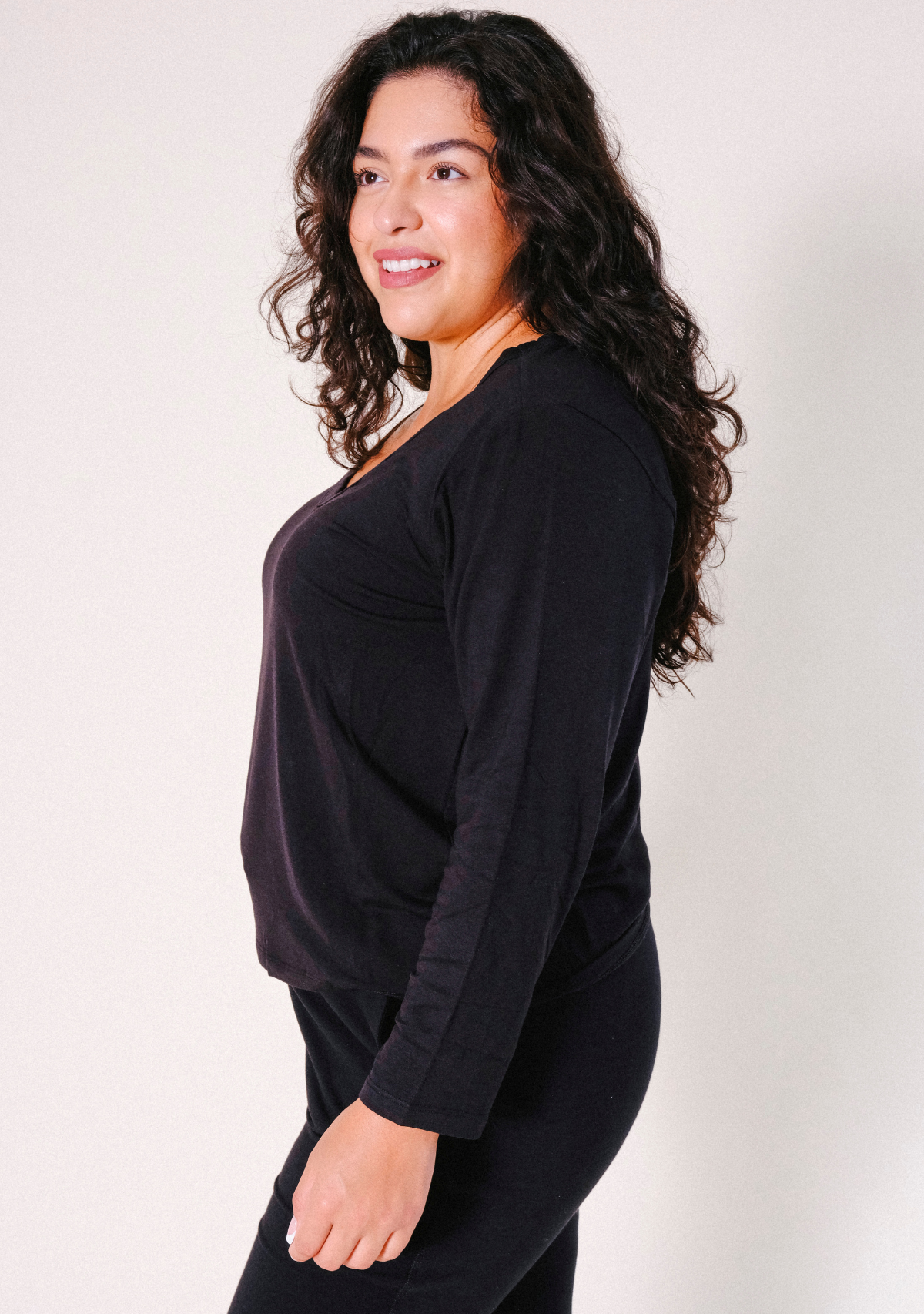 Our Toni Pajama Shirt in classic Black gives you the comfort you crave for lounging, relaxing, or a good night’s sleep. Made from a lightweight blend of Rayon from Bamboo and Cotton Jersey. The fabric is buttery-soft, cool, and gentle on the skin. Details include a v-neck chest, long sleeve, and relaxed fit. Pairs nicely with our Toni Pajama Pant in Black. Made in Los Angeles, California. FINAL SALE