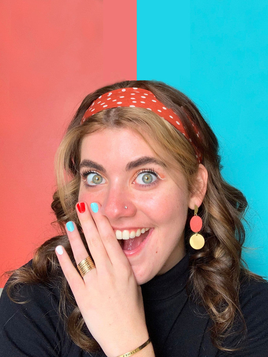 Made in India, covered in upcycled fabric, these dangle studs are a fun coral color. Stand out with these bold oval shaped earrings.