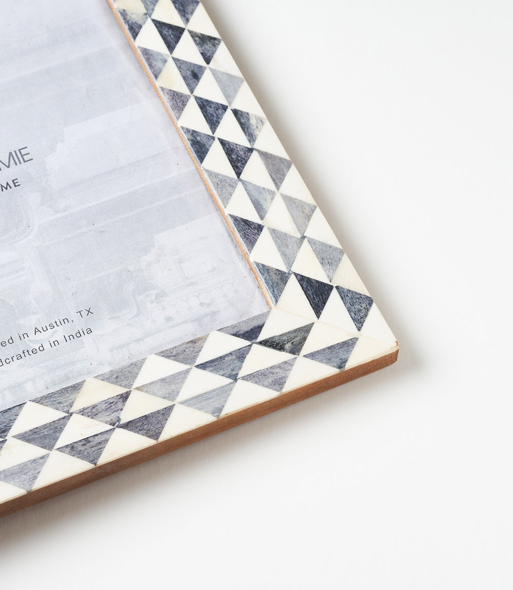 Our Varuna Collection incorporates traditional Indian art forms in modern, sea-inspired designs handcrafted from ethically sourced bone tile. Master artisans in Old Delhi skillfully assemble elements to create unique, eye-catching mosaic designs. This handcrafted photo frame is thoughtfully designed for stylish display with a triangle wave design in gray.
