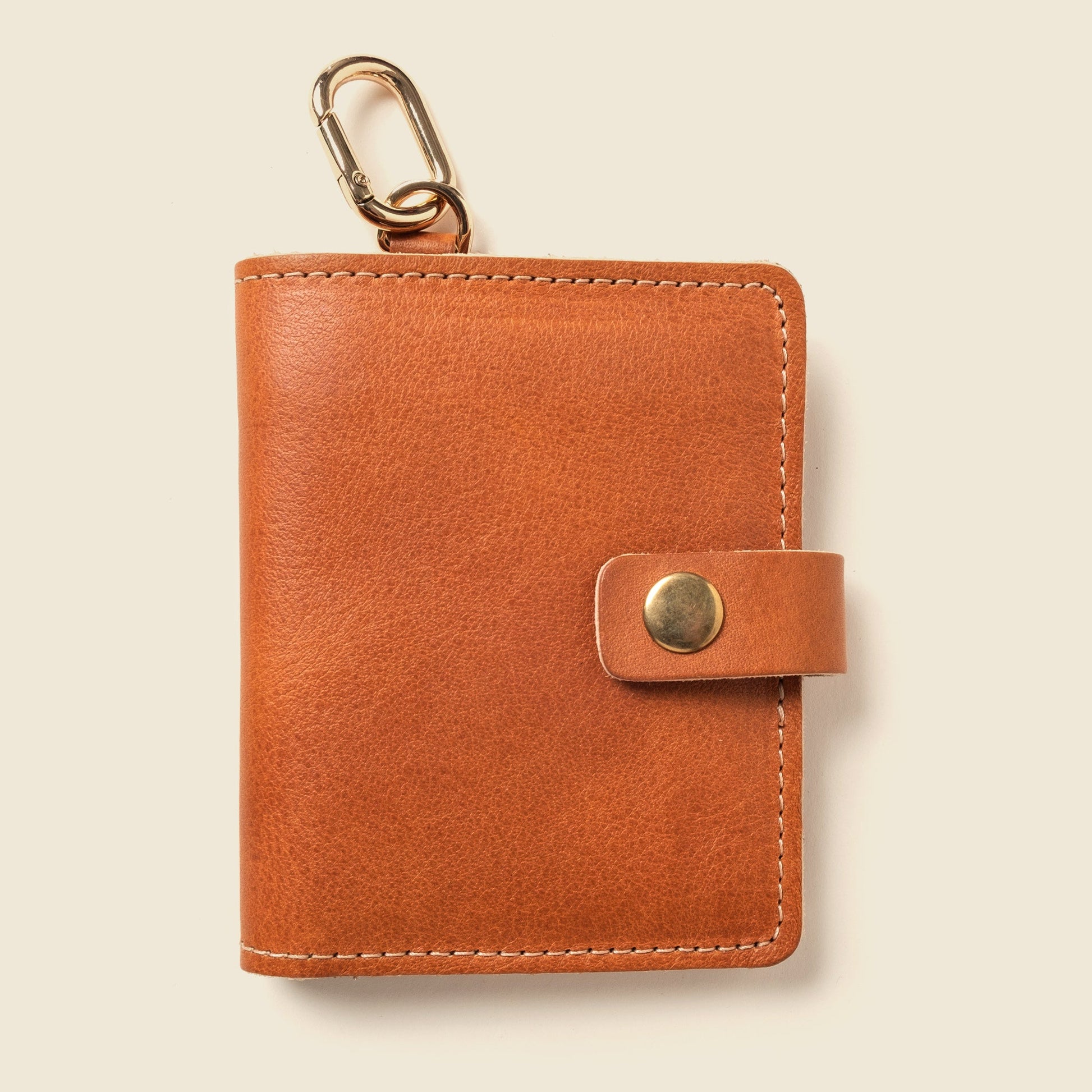 New bifold natural leather wallet with snap closure and a carabiner ring to attach keys if desired. The carabiner is detachable if you don't want to use it.