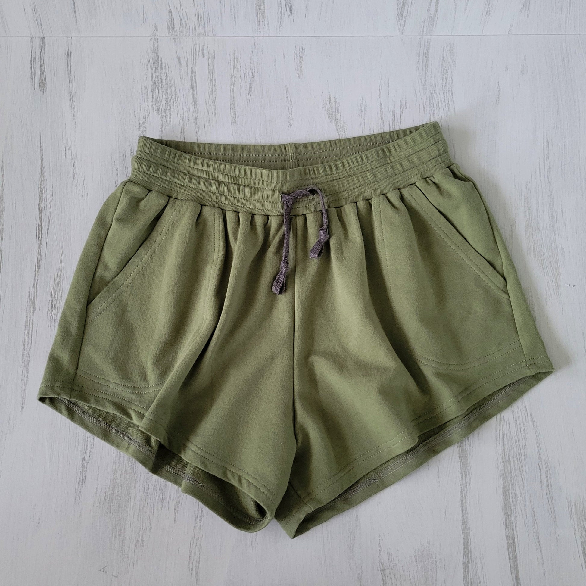 The Shorts are made with medium weight, stretchy organic French Terry. They fit loose and flowy, the length is about mid thigh. The wide elastic waistband sits right at your natural waist.